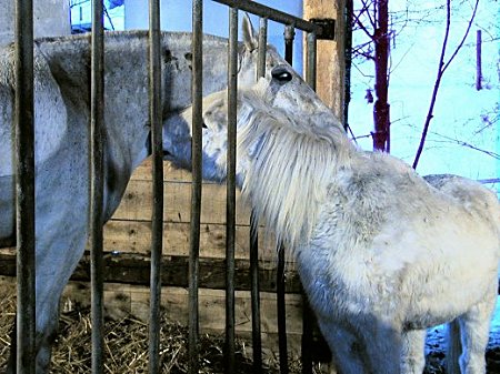 Pferdefreundschaften sind auch trotz Abtrennung erkennbar. Dies ist am besten möglich, wenn senkrecht verlaufende Abtrenngitter zum Einsatz kommen. Die Strukturierung des Eingliederungsbereiches sollte deshalb so gestaltet sein, dass die Pferde soziale Kontakte aufnehmen können und dennoch vor Angriffen geschützt sind. |